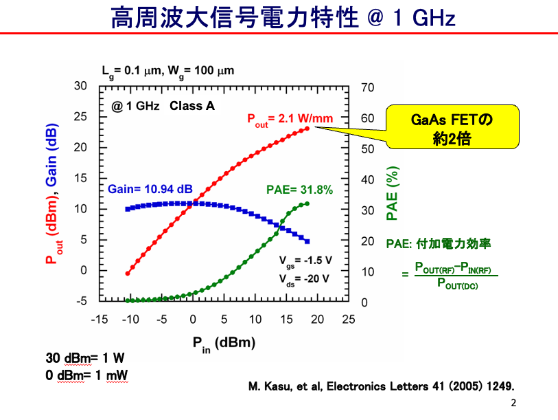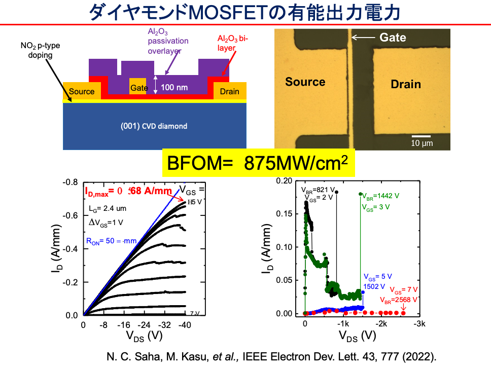 2011年10月佐賀大学に転任。研究室は机、椅子だけでしたが、多くの企業の皆様、多くの大学関係者の皆様のご支援により、ダイヤモンドの結晶成長からデバイス開発、高周波特性測定まで、一貫して研究を進め、GaNに匹敵する、有能出力電力(Baliga’s FOM= 875 MW/cm2)を記録しました。 [image; ダイヤモンドMOSFETの有能出力電力]